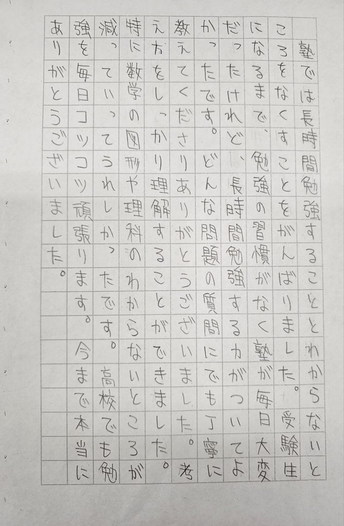 塾では長時間勉強することと、わからないところをなくすことをがんばりました。受験生になるまで、勉強の習慣がなく塾が毎日大変だったけれど、長時間勉強する力がついてよかったです。どんな問題の質問にでも丁寧に教えてくださりありがとうございました。考え方をしっかり理解することができました。特に数学の図形や理科のわからないところが減っていってうれしかったです。高校でも勉強を毎日コツコツ頑張ります。今まで本当にありがとうございました。